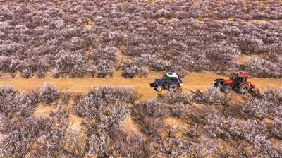 当前,洮南市聚宝乡长久村的杏花正值花期。图为村民开着农机在花海中穿过。 邱会宁 范海辉摄