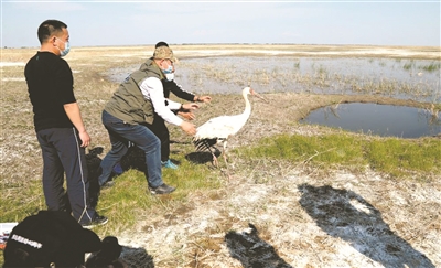 近日,中动协白城护飞队与莫莫格国家级自然保护区联合开展“护飞行动”,将一只春季救护的国家一级保护动物白鹤亚成体在镇赉县东屏镇二龙涛河流域成功放飞。目前这只鹤已融入鹤群,状态良好。 潘晟昱 张慧超摄