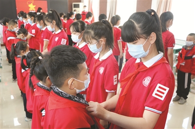 在“六一”儿童节到来之际,共青团白城市委、白城市少工委组织开展了“喜迎二十大 争做好队员”入队仪式活动。图为在洮南市第二小学入队仪式上,老队员为新队员佩戴红领巾。 白团宣摄