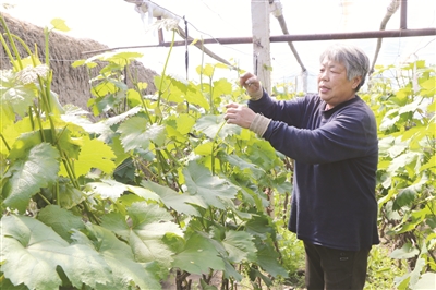 洮北区西郊街道办事处代家村采取“党支部+公司+农户”的方式发展棚膜经济,目前全村有100余户农民参与,共经营大棚200栋、近10万平方米,主要种植香瓜、油桃以及西红柿、辣椒、黄瓜等应季水果和蔬菜,年收入500多万元。图为农民在侍弄大棚。 连科 本报记者张殿文摄