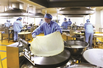 白城市高高特色煎饼有限公司2020年9月落户白城工业园区,企业采用传统工艺与现代工艺相结合方式,生产以“白燕2号”为主要原料的燕麦煎饼,因其“绿色健康”深受消费者喜爱,燕麦煎饼远销北京、上海、辽宁、黑龙江、内蒙古等地。图为工人在生产工作中。本报记者王野村摄