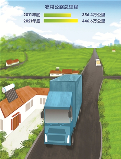 十年来,我国累计新建改建农村公路约253万公里,解决了1040个乡镇、10.5万个建制村通硬化路的难题;农村公路总里程从2011年底的356.4万公里增加到2021年底的446.6万公里。如今,“交通+电商”融合发展,“山货进城、城货下乡”,促进了农村增收、农民致富。