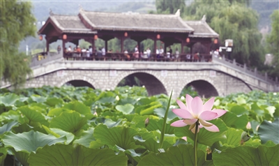 七月二十五日,游人在陕西省商洛市丹凤县棣花古镇的风雨桥上观赏荷花。