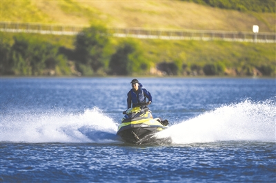 七月二十七日,一位市民在南宁市邕江上体验摩托艇。