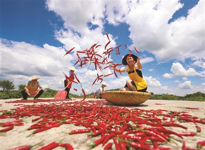 8月13日,村民在贵州省黔东南苗族侗族自治州岑巩县平庄镇包东村晾晒辣椒。 新华社发(胡攀学摄)