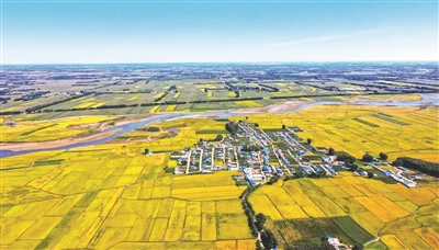 秋高气爽,稻谷飘香。洮南市水稻主产区福顺镇连片的稻田已丰收在望,潺潺的流水、蔚蓝的天空、金灿灿的稻田相互映衬,构成了一幅美丽的乡村田园画。图为鸟瞰金黄稻田中的福顺镇富裕村。 郑丹 本报记者李晓明摄