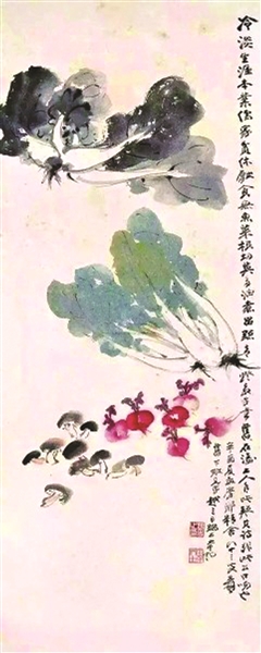 张大千还有不少与饮食有关的作品。在1978年《菜根香》这幅画中,所呈现的对象就是普通百姓日常饭桌上的蔬菜,如萝卜、白菜、蘑菇、茄子、冬瓜等。从材质上,看得出来食物青翠欲滴,非常新鲜,仿佛刚从菜地里采摘回来不久。画面旁边还题了一首石涛的七绝:“冷淡生涯本业儒,家贫休厌食无鱼。菜根切莫多油煮,留点青灯教子书。”在这里,清脆的白菜和鲜嫩的菜根,被艺术家赋予一种特殊的精神品格。