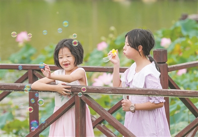 9月11日,小朋友在贵州省铜仁市玉屏侗族自治县茶花泉景区吹泡泡。