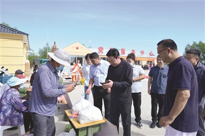 近日,中国农业银行通榆县支行、通榆县新华镇联合在新华镇新农村举办了以“喜迎二十大 奋进新征程”为主题的党建共建篮球联谊赛。同时,该镇17户脱贫户把农产品搬上赛场进行售卖,通榆县政府相关负责人还为农产品进行了代言,在不到半天的时间里,所有产品销售一空。图为销售场景。 常达 陈宝林摄