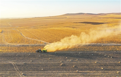 日前,在我市的各片耕地上可以看到,农民已使用机械将秸秆打包,远远望去,成为一道风景线。秸秆就地打捆早离田,能使秸秆高效综合利用,既保护了环境又增加了农民收入。截至11月17日,全市已完成秸秆打包735.66万亩,完成率52.56%;完成秸秆离田579.2万亩,完成率41.38%。图为洮南市那金镇秸秆打包作业现场。 本报记者 李晓明摄
