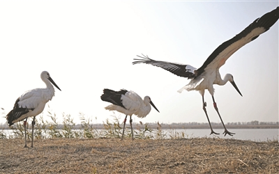 当日,天津市宁河区林业局将3只具有野外生存能力的东方白鹳在七里海湿地放归自然。