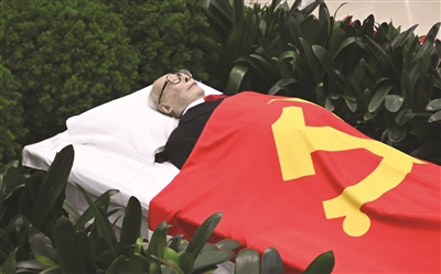 中国人民解放军总医院告别室庄严肃穆。洁白的花朵、黑色的挽幛,寄托着人们深深的哀思。告别室上方悬挂着黑底白字横幅,上面写着:“江泽民同志永垂不朽”,横幅下方正中是江泽民同志的大幅彩色遗像。江泽民同志的遗体安卧在鲜花翠柏丛中,身上覆盖着鲜红的中国共产党党旗。4名礼兵持枪肃立,守护在两旁。江泽民同志遗体前摆放着江泽民同志的夫人王冶坪率全家敬献的花篮,花篮的缎带上写着:“你永远活在我们心中”。告别室内摆放着习近平、李克强、栗战书、汪洋、李强、赵乐际、王沪宁、韩正、蔡奇、丁薛祥、李希、王岐山、胡锦涛和中共中央、全国人大常委会、国务院、全国政协、中央军委、各民主党派和全国工商联、各人民团体、首都各界群众敬献的花圈。