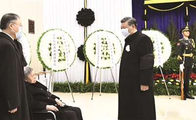 上午10时,在低回的哀乐声中,习近平、李克强、栗战书、汪洋、李强、赵乐际、王沪宁、韩正、蔡奇、丁薛祥、李希、王岐山、胡锦涛等,胸佩白花、臂戴黑纱缓步来到告别室,在江泽民同志的遗体前肃立。习近平等向江泽民同志的遗体三鞠躬,表达对江泽民同志的崇高敬意和深切缅怀。随后,习近平等向江泽民同志的夫人王冶坪和亲属表示深切慰问。