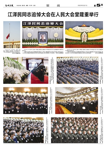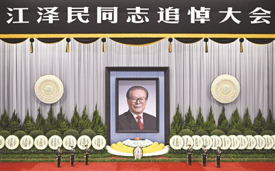 十二月六日上午,中共中央、全国人大常委会、国务院、全国政协、中央军委在北京人民大会堂隆重举行江泽民同志追悼大会。