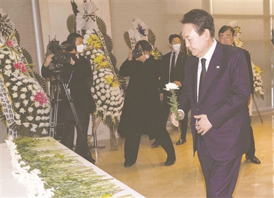 | 12月2日,韩国总统尹锡悦在中国驻韩国大使馆吊唁江泽民同志。 新华社发(李相浩摄) |