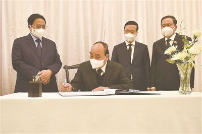 | 12月2日,越南国家主席阮春福(左二)、总理范明政(左一)等在中国驻越南大使馆吊唁江泽民同志。 新华社记者胡佳丽摄 |