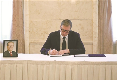 | 12月3日,塞尔维亚总统武契奇在中国驻塞尔维亚大使馆吊唁江泽民同志。 新华社发(中国驻塞尔维亚大使馆供图) |