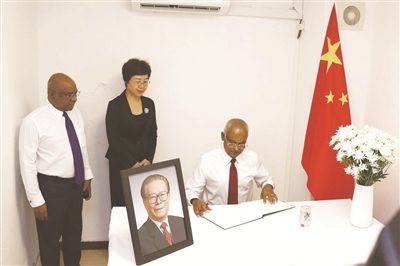 | 12月5日,马尔代夫总统萨利赫(右)在中国驻马尔代夫大使馆吊唁江泽民同志。 新华社发(中国驻马尔代夫大使馆供图) |