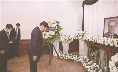 | 12月5日,老挝总理潘坎在中国驻老挝大使馆吊唁江泽民同志。 新华社发(凯乔摄) |