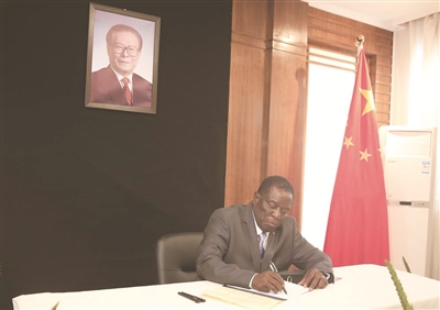 | 十二月五日,津巴布韦总统姆南加古瓦在中国驻津巴布韦大使馆吊唁江泽民同志。 新华社发(肖恩·朱萨摄) |
