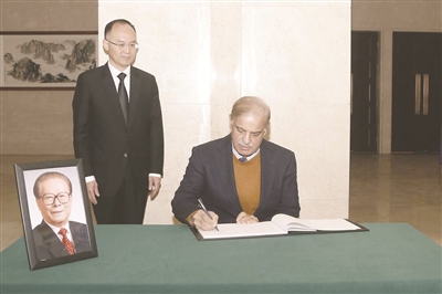 | 12月1日,巴基斯坦总理夏巴兹在中国驻巴基斯坦大使馆吊唁江泽民同志。 新华社发(艾哈迈德·卡迈勒摄) |