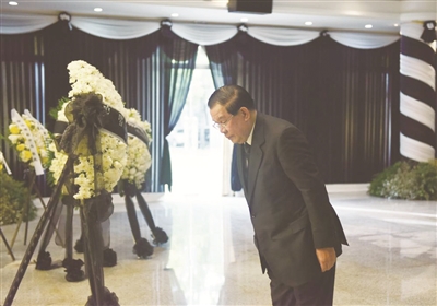 | 12月5日,柬埔寨首相洪森在中国驻柬埔寨大使馆吊唁江泽民同志。 新华社发(万坡摄) |