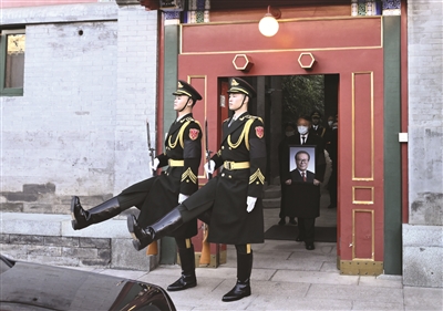 上午8时10分,蔡奇和治丧委员会办公室领导同志,同江泽民同志亲属,来到这里肃立,怀着极其沉痛的心情和深切的缅怀之情,向江泽民同志遗像三鞠躬。随后,江泽民同志的亲属捧着遗像、骨灰盒和花圈,缓步走出来福堂。