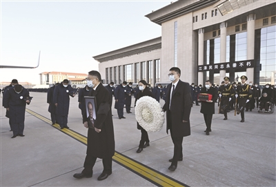 灵车缓缓驶入西郊机场。松柏静立,远山静默。空军官兵列队脱帽,目送载护江泽民同志骨灰的专机起飞。专机盘旋着,在首都北京上空缓缓绕飞一周,告别这一江泽民同志为党和国家事业倾尽心血的地方。