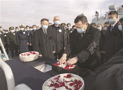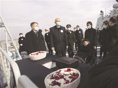 中午12时35分,扬州舰抵达长江入海口水域。在军舰甲板上,送别的人们,肃立默哀。水天肃穆,波翻浪涌。蔡奇和江泽民同志的夫人王冶坪等亲属,眼含热泪,强忍悲痛,将江泽民同志的骨灰和缤纷的花瓣一起缓缓撒向无垠的江海。