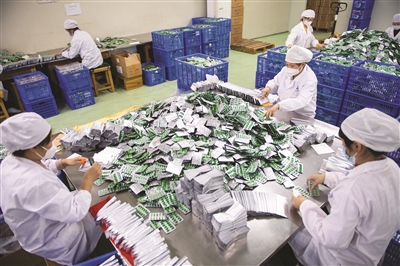 12月19日,在湖南浏阳经开区一制药企业生产车间,工作人员在包装药物。