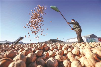 12月21日,农民在河北省遵化市东旧寨镇一家核桃专业合作社的场院晾晒核桃。
