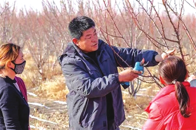 洮南市委编办干部刘大勇积极响应乡村振兴号召,今年6月到洮南市黑水镇友好村担任乡村振兴指导员。他利用自身的果树管理特长,为果农传授冬季果树修剪技术。图为近日,刘大勇为果农讲解冬季果树剪枝技巧。 本报记者李晓明摄