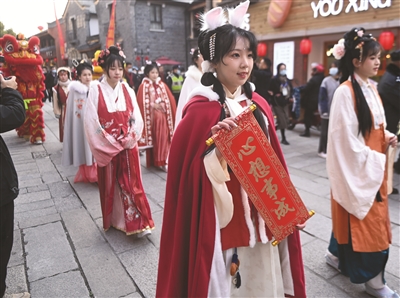 新登镇宋韵文化特色街区的汉服巡游活动(1月16日摄)。