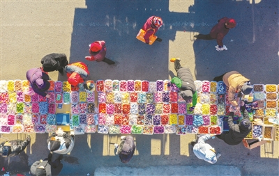春节临近,白城市各个乡镇大集分外红火,人头攒动、车水马龙,充满了浓浓的烟火气。灯笼、对联、福字、糖果……各式各样的年货,还有写满幸福感的张张笑脸! 本报记者李晓明摄影/报道