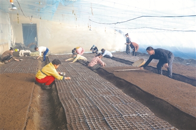 为了让香瓜抢先上市,洮南市福顺现代农业产业园巧打“时间差”,日前对10万棵瓜苗进行育苗,并将陆续移栽到25个大棚中。图为村民在大棚内育苗。 邱会宁 范海辉摄