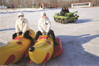 洮南市西郊公园滑雪场冰雪面积三万平方米,包括冰上自行车、冰上坦克、冰上摩托、七彩滑道、儿童乐园等冰雪项目三十多种,其中雪道高二十五米、长二百四十米、角度为一百二十度。图为游客在玩冰上坦克和香蕉船。 鲍长志 本报记者王野村摄