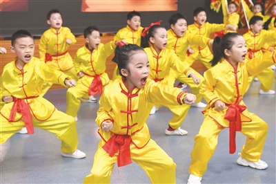2月6日,学生在广西南宁市滨湖路小学教育集团滨湖校区开学仪式上表演武术。