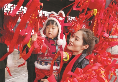2月6日,一名家长带着小朋友在全椒县太平桥上系“平安带”祈福。