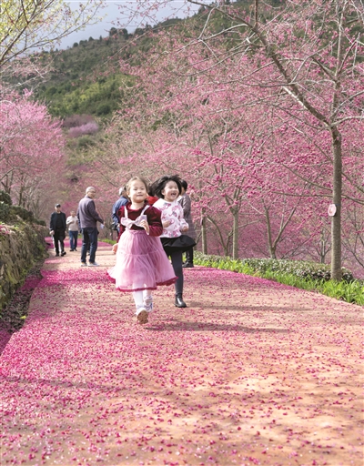 2月12日,福建省南靖土楼景区的紫云山生态园中,小朋友在樱花树下奔跑嬉戏。