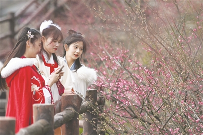 2月14日,游客在原乡小镇景区内的瀛洲梅园赏梅。