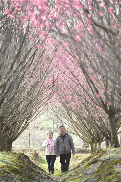 2月14日,游客在安徽省巢湖市庙岗镇清水湾梅花园里赏花。