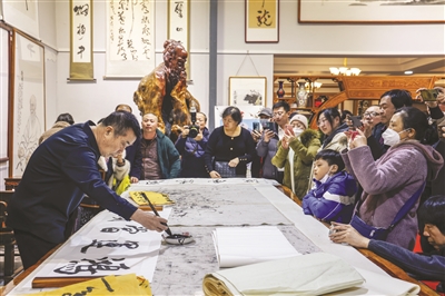 2月18日,吉林省中小企业国际合作协会书画院在我市举办了2023年新春见面会暨全省著名书画家笔会。活动中,书画家们挥毫泼墨,交流切磋,现场热闹非凡。图为书画家现场创作,吸引了众多书画爱好者驻足观看、拍照留念。本报记者 王野村 郭梓钦摄