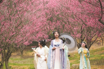 2月19日,游人在浙江省湖州市德清县下渚湖街道上杨村梅花园赏梅踏青。