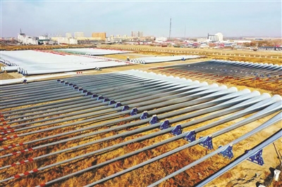 近年来,通榆县在风电装备制造上,大到风机整机、小到紧固小件,上到叶片、下到地下线缆,内到螺丝、外到整件,所有风机部件,全部都能生产,已经成为全国唯一一个集风电主机叶片、塔筒、机舱罩、电机、紧固件等风电全产业链“一站式采购”的城市。图为通榆三一零碳智造产业园生产的风机主机叶片。 王志鹏 本报记者李晓明摄