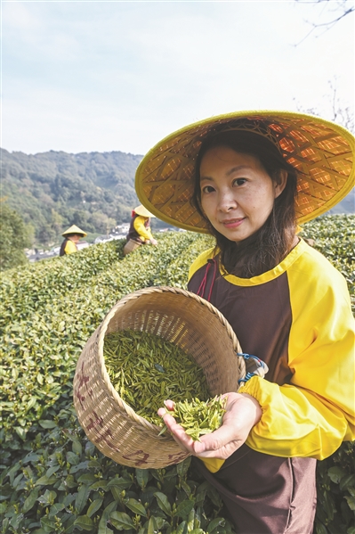 3月13日,龙井村的茶农徐雅军在展示刚刚采摘的西湖龙井鲜叶。
