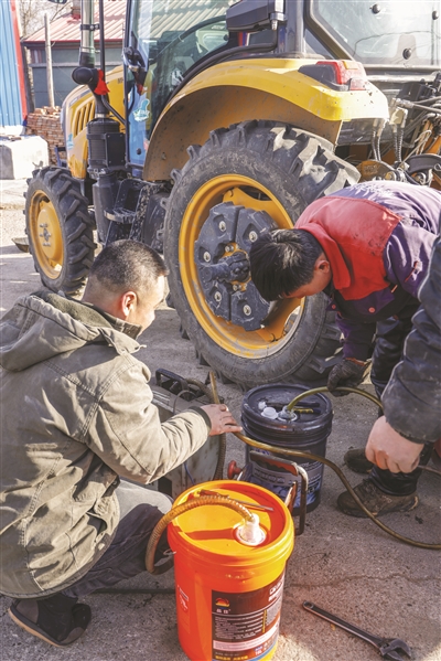 连日来,洮南市蛟流河乡各农机修理部生意红火,农民们早早地做好准备,把自家的农机具进行维修保养,随时投入春耕生产中。图为维修师傅对农机具进行维修保养。 本报记者李晓明摄
