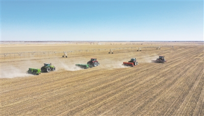 洮南圣一金地生物农业有限公司于三月二十一日正式开始播种小冰麦,播种面积一万亩,日前播种全部完成。图为机械播种小冰麦的场景。 本报记者李晓明摄