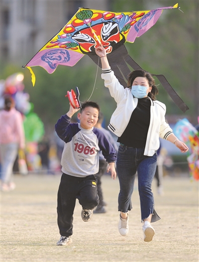 4月1日,家长带着孩子在山东省滕州市市民广场放风筝。