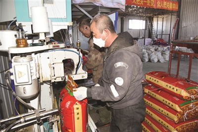 通榆县八面乡农民付春龙联合多家农户,成立了大段河谷子种植合作社,实行“统一品种种植,统一技术管理,统一品牌包装销售”,其中小米销往北京、山东菏泽、广州等多个城市,为八面乡集中化、科学化种植奠定了坚实基础。图为农民在生产车间包装农产品。 王志鹏摄