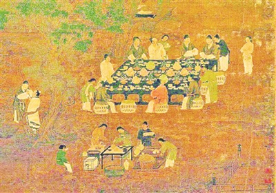 “一日三餐”对今人是平常事,实际上到了宋代才逐渐普及起来。原先是一日两餐制,上午下午各一餐。宋人对饮食非常讲究,“凡饮食珍味,时新下饭,奇细蔬菜,品件不缺”。市场的扩大,对饮食的精致追求,促使宋朝诞生了花样繁多的美食。《东京梦华录》“饮食果”条,《梦粱录》“分茶酒店”条、“面食店”条、“荤素从食店”条、《武林旧事》“市食”条,都罗列了长长的美食、小吃、点心名单,数也数不过来。